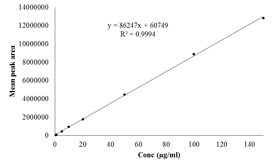 The limit of quantification (LOQ) and limit of detection (LOD) was based on the standard deviation of the response and the slope of the constructed calibration curve (n=3), as described in International Conference on Harmonization guidelines Q2 (R1) [17, 25].