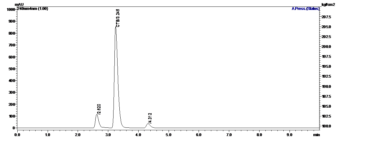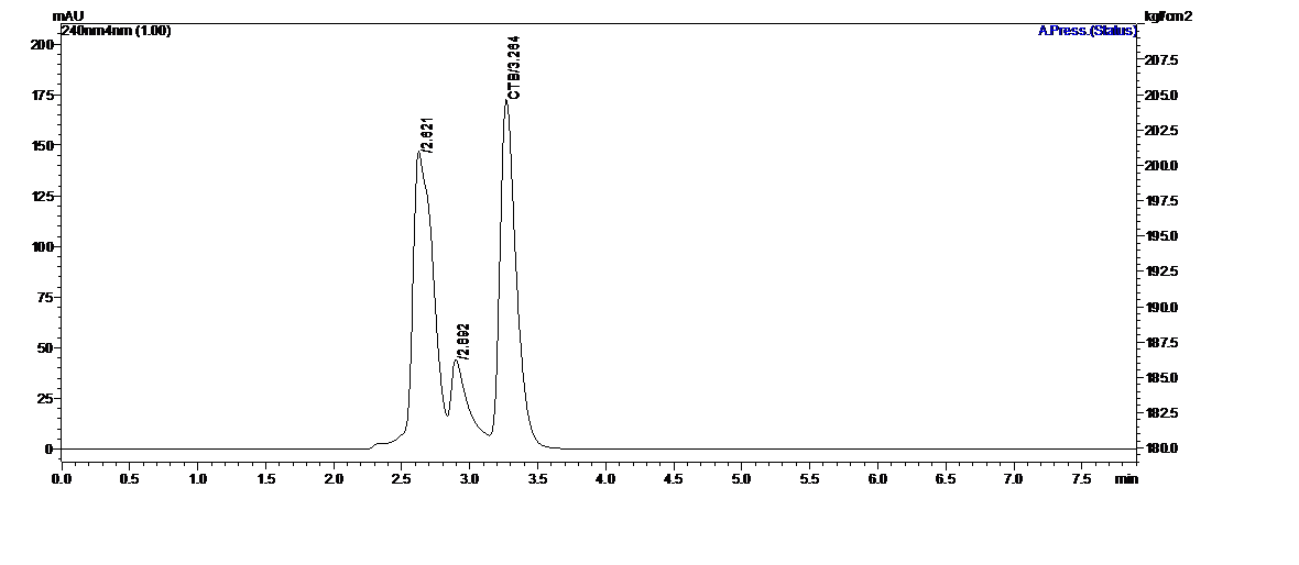 The complete separation of the analytics was accomplished in less than 10 min and the method can be successfully applied to perform long-term and accelerated stability studies of CTB formulations.