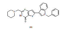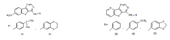 Loidreau et al., 2013 synthesized two series of novel N-aryl-7-methoxybenzo[b]furo[3,2-d]pyrimidin-4-amines and their N-aryl-7-methoxybenzo[b]thieno[3,2-d]pyrimidin-4-amine analogues using microwaves via a Dimroth rearrangement. The synthesized compounds weretested in vitro to evaluate their inhibition potential on five different kinases-CDK5/p25 (cyclin-dependent kinase), CK1δ/ε (casein kinase 1), GSK3α/β (glycogen synthase kinase 3), DYRK1A (dual-specificity tyrosine phosphorylation regulated kinase) and CLK1 (cdc2-like kinase 1). Among all these compounds, the benzothieno[3,2-d]pyrimidine derivative 1 and 2 showed interesting inhibition at a sub-micromolar level and showed selectivity towards CLK1 and DYRK1A kinase [5]. A series of N-arylbenzo[b]thieno[3,2-d]pyrimidin-4-amines and their pyrido and pyrazino analogues were designed, synthesized and characterized by Loidreau et al., 2012 via microwave-accelerated condensation and Dimroth rearrangement. The inhibitory potency of the final products was tested against five Ser/Thr kinases (CDK5/p25, CK1δ/ε, CK1δ/ε, DYRK1A and CLK1). N-aryl pyrido [3’,2’:4,5]thieno[3,2-d]pyrimidin-4-amine derivatives 3, 4 and 5 were found to be potent inhibitors of CK1 and CLK1 kinases [6].