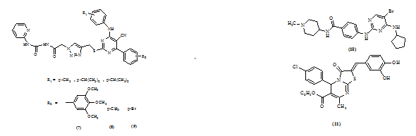 1,2,3-Triazole–pyrimidine–urea derivatives were designed, synthesized and evaluated for anticancer activity against by Ma et al., 2015. These synthesized compounds were tested against four cell lines: MGC-803, EC-109, MCF-7, and B16-F10. Almost all of the synthesized compounds showed moderate to potent activity against all the cancer cell lines. But compounds 7, 8 and 9 showed promising growth inhibition against B16-F10 (IC50 = 32 nM, 35 nM and 42 nM, respectively). Furthermore, flow cytometry study revealed that compound 7 induced the cellular apoptosis in a concentration-dependent manner [9]. Qin et al., 2015 synthesized some of the 2,4-diaminopyrimidine derivatives and tested them for their biological activities, including anti-proliferation, inhibition of Aurora kinases and cell cycle effects. All the synthesized compounds exhibited more potent cytotoxicity against tumor cell lines compared with the VX-680 control. Compound 10 showed the highest cytotoxicity (IC50=0.5-4.0 μM) and showed more than 35-fold more selectivity for Aurora A over Aurora B. Molecular docking analysis also revealed that this compound showed better interaction with Aurora-A both from the perspective of structure and energy. Furthermore, compound 10 induced G2/M cell cycle arrest in HeLa cancer cell lines. Thus, these synthetic compounds have the potential for further development as selective Aurora A inhibitors for anticancer activity [10]. Jin et al., 2014 designed, synthesized and characterized ethyl 2-(benzylidene)-7-methyl-3-oxo-2,3-dihydro-5H-thiazolo[3,2-a]pyrimidine-6-carboxylate derivatives. Compound 11 was identified as good inhibitor of PKCK2 with IC50 = 0.56 μM that is 2.2-fold more potent and selective than 4,5,6,7-tetrabromobenzotriazole (TBB) with IC50 = 1.24 μM. The Ki values of compound 11 and TBB for PKCK2 were 0.78 μM and 2.70 μM, respectively. Therefore, compound 11 inhibited endogenous PKCK2 kinase and showed promising antiproliferative activity worthy of further characterization [11].