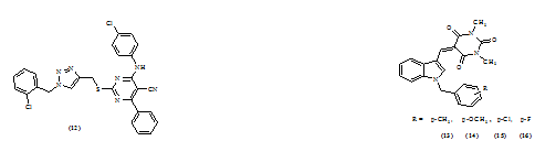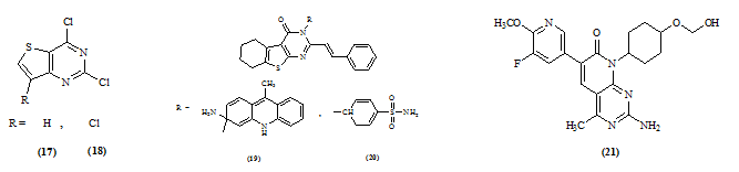 A class of novel 1,2,3-triazole-pyrimidine analogs was designed and synthesized by Ma et al., 2014 and also reported their anticancer activity against four cancer cell lines (MGC-803, EC-109, MCF-7, and B16-F10). Among the synthesized compounds, 12 showed the most excellent anticancer activity with IC50 = 1.42 to 6.52 mM. Further studies showed that compound 12 could inhibit the proliferation of EC-109 cancer cells by inducing apoptosis and arresting the cell cycle at G2/M phase [12]. Madadi et al., 2014 synthesized a library of substituted 5-((1-benzyl-1H-indol-3-yl) methylene)-1,3-dimethyl pyrimidine-2,4,6(1H,3H,5H)-triones. All the synthesized compounds were tested on 60 types of human tumor cell lines for their in vitro cell growth inhibition and cytotoxicity. Compounds 13, 14, 15 and 16 were found highly potent anti-cancer agents against ovarian, renal and breast cancer cell lines. The 4-methoxy-N-benzyl analog (14) was reported as the most active compound against OVCAR-5 ovarian cancer cells and MDA-MB-468 breast cancer cells with GI50 =20 nM and 40 nM, respectively. While compounds, 13 and 16 were found equally potent (GI50 = 30 nM) against MDA-MB-468 cells. Against renal cancer cell line A498, compound 15 was found most potent (GI50 =40 nM). The study suggests that these compounds may act as lead for development of candidate drugs to treat a variety of solid tumors [8]. Temburnikar et al., 2014 synthesized halogenated thieno [3,2-d]pyrimidine derivatives and evaluated them in vitro for their anti-proliferative activity against three different cancer cell lines-L1210 (a mouse lymphocytic leukemia cell line), CCRF-CEM (an acute lymphoblastic leukemia cell line), and HeLa (a cancer cell line derived from a human cervical adenocarcinoma). A structure-activity relationship study indicated the presence of the chlorine at the C4-position is essential for anti-proliferative activity. The two most active compounds 17 and 18 were found to induce apoptosis in the leukemia L1210 cell line and found most active against all three cell lines [13].
