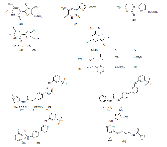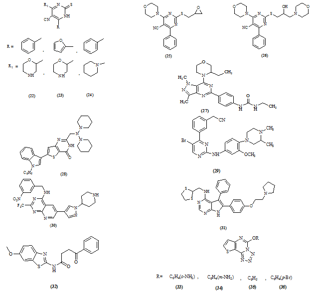 Abbas et al., 2013 designed, synthesized, characterized and evaluated two series of new tetrahydrobenzo [4,5] thieno [2,3-d]pyrimidines namely 2,3-disubstituted derivatives and 2,4-disubstituted ones for their antitumor potential. Compound 19 showed excellent antitumor activity against breast MCF-7 (IC50 =0.19 mM) compared to standard Doxorubicin (IC50 = 5.46 mM). Compound 20 was the most active one against liver HEPG-2 cancer cell line (IC50 =1.29 mM) as regard to Doxorubicin (IC50 =7.36 mM) [14]. Cheng et al., 2013 designed 4-methylpyridopyrimidinone series and tested for antitumor activity against PI3K, AKT, and mTOR kinases. Among them, compound 21 (PF-04691503) showed excellent in vitro potency and robust ADMET properties, and screened for in vivo antitumor efficacy model, and showed good tumor growth inhibition [15]. Analogs of pyrimidine-5-carbonitrile have been designed, synthesized and characterized by Fargualy et al., 2013. Among the synthesized compounds, selected members were evaluated for their anticancer activity against certain human tumor cell lines. The most active anticancer compounds found were 22, 23, 24, 25 and 26. Among these, compounds 25 and 26 exhibited strong interactions with dihydrofolate reductase enzyme [16]. Lee et al., 2013 designed synthesized and characterized N-7-methyl-imidazolopyrimidine derivatives. All the synthesized compounds were tested for their anticancer potential based on the hypothesis that the N-7-methyl substituent on imidazole pyrimidine would show selectivity for mTOR over the related PI3Kα and δ kinases. Among them, the pyrazolo [4,3-d]pyrimidine derivative 27 was found most potent compound [17]. Perspicace et al., 2013 designed, synthesized and evaluated a new class of thieno [3,2-d] pyrimidinone as an inhibitor of vascular endothelial growth factor receptor-2 (VEGFR-2). As predicted by the 3-D QSAR approach, compound 28 showed the highest activity and also biological assays on endothelial cell tube formation proved it as a new anti-angiogenic compound in inhibiting endothelial cell tube formation induced by VEGF compared with Sunitinib [7]. Xu et al., 2013 synthesized and evaluated a new series of 2-arylamino-4-aryl-pyrimidine derivatives for PAK1 kinase inhibitor anticancer properties in various colon cancer cell lines. Among them, compound 29 was found to be potent inhibitors of PAK1 kinase inhibitor. The kinase selectivity of compound 29 was investigated by screening against 81 of 118 different kinases. Compound 29 showed strong inhibition of kinases JAK1-3, FLT1, FLT3-4, CHK1, and Aurora A, and therefore, compound 29 showed broad selective profile. The overall selectivity was determined by Gini coefficient = 0.40 for this molecule [18]. Wu et al., 2012 designed, synthesized a library of pyrido[2,3-d]pyrimidine frameworks and tested for their c-Met inhibitory potency. Among the series, N-linked analogus demonstrated c-Met inhibitory potential. The 3-nitrobenzyl analog 30 showed the highest activity with IC50 value of 6.5 nM [19]. Two novel series of furo[2,3-d]pyrimidin-4-amines and 7H-pyrrolo[2,3-d]pyrimidin-4-amines were designed, synthesized and characterized by Jiao et al., 2012. Both the series were evaluated for their antiproliferative property. 1,3-Dithiolane-substituted pyrazolopyrimidine 31was found to have potent in vitro ACK1 kinase inhibitor activity and displayed good kinase selectivity [20].