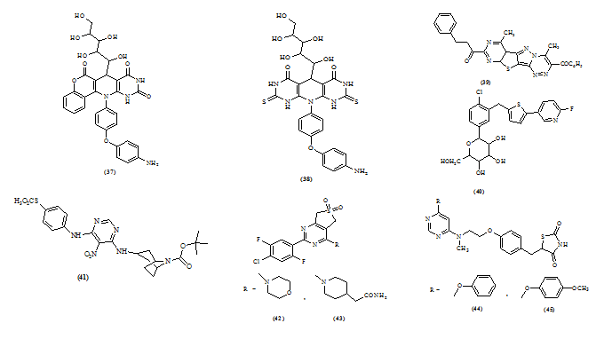 Toobaei et al., [25] Designed, synthesized and evaluated poly-hydroxyl functionalized acridine derivatives. These synthesized derivatives were tested for their inhibitory activities against α-Glucosidase (α-Gls) and α–Amylase (α-Amy). Among the synthetic compounds, 37 with a chromeno [3’,4’:5,6] pyrido[2,3-d]pyrimidine moiety demonstrates the highest inhibitory activity against both yeast and rat α-Gls enzymes. Also, 38 with the thioxo-pyrido[2,3-d:6,5-d”] dipyrimidine moiety displays an important role in yeast α-Gls inhibition. Therefore, 37 showed good inhibitory activity against α-Gls and a poor ability for inhibition of α-Amy and can be used as an important anti-diabetic agent for management of postprandial hyperglycemia [25]. Al-Harbi et. al., 2013 designed and synthesized a new class of poly-fused pyrazolothieno pyrimidine derivatives. All the synthesized compounds were tested for their hypoglycemic activities against standard pioglitazone (i. p., 5 mg/kg). All the synthesized compounds and the standard were found to have equipotent hypoglycemic activity (37.2±2.1-121.5±5.7). Compound 39 was found to be potential hypoglycemic agent [1]. C-glucosides having a heteroaromatic ring were designed, synthesized and evaluated for their inhibitory activities against SGLT2 by Koga et al., 2013 in high-fat diet fed KK (HF-KK) mice. Among the tested compounds, compound 40 was found to be very potent and selective inhibitor of hSGLT2. The anti-hyperglycemic effect was also observed in HF-KK mice for oral administration. Therefore, this compound can be a lead compound for the treatment of type II diabetes [24].