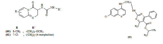 Mane et al., 2012 synthesized a group of pyrido [1,2-a]pyrimidin-4-ones and screened them for their in vitro FP-2 inhibitory potential. The studies described Plasmodium falciparum cysteine protease falcipain-2 (FP-2) as a promising target for antimalarial chemotherapy and proved that inhibition of this protease affects the growth of parasite adversely. It was found that compounds 60 and 61exhibited excellent FP-2 inhibition and may serve as lead compounds for further investigation of potent FP-2 inhibitors as potential antimalarial drugs [35]. 4-Aminoquinoline pyrimidines were designed, synthesized and characterized by Singh et al., 2013.