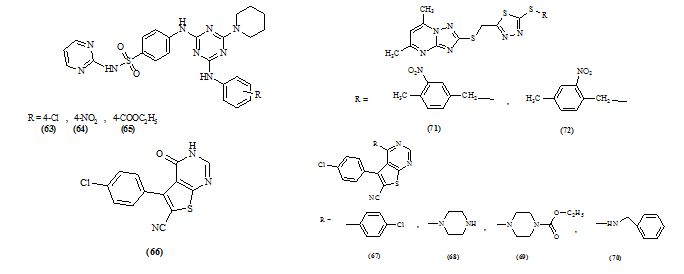 Desai et al., 2015 synthesized a series of 4-(4-(arylamino)-6-(piperidin-1-yl)-1,3,5-triazine-2-ylamino)-N-(pyrimidin-2-yl) benzene sulfonamide analogs and evaluated them for their in vitro antimicrobial activity. Synthesized compounds were evaluated against Gram-positive bacteria [S. aureus (MTCC 96), S. pyogenes (MTCC 442)], Gram-negative bacteria [E. coli (MTCC 443), P. aeruginosa (MTCC 1688)] and fungal strains [C. albicans (MTCC 227), A. niger (MTCC 282), A. clavatus (MTCC 1323)]. Compounds 63, 64 and 65 exhibited significant antimicrobial activity on several strains of microbes [39]. Kanawade et al., 2013 designed some thermal selective reactions to synthesize a class of 4-aminothieno [2,3-d]pyrimidine-6-carbonitrile derivatives. These environmentally benign neat heat reactions gave products in good yield and in comparatively shorter time to conventional method. All the synthesized compounds were tested for their antimicrobial activity against several bacteria such as Staphylococcus aureus MTCC-96, Escherichia coli MTCC-443, Pseudomonas aeruginosa MTCC-4 41, Streptococcus pyogenes MTCC-442 and fungi Aspergillus niger MTCC-282, Aspergillus clavatus MTCC-1323, Candida albicans MTCC-227 using broth microdilution method. It was observed that compound 66, 67, 68, 69, 70 and 71 showed good antibacterial activity compared to standard ampicillin and compounds 69 and 70 proved to be better antifungal agent compared to griseofulvin [40].