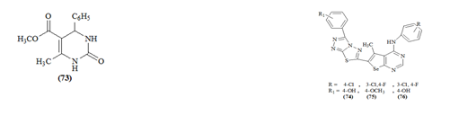 The mitochondrial overproduction of superoxide radical plays an important role in activation of the other downstream path physiologic cycles which are involved in the further production of reactive oxygen species (ROS) [42]. Furthermore, pyrimidine derivatives have been proved as good antioxidants which can neutralize free radicals. Thus, antioxidants that forage reactive oxygen species may be of great value in preventing the onset and propagation of oxidative diseases such as autoimmune diseases, cardiovascular diseases, and neurovascular diseases and also show hypoglycemic and antibacterial properties. The homeostatic balance between the reactive oxygen species (ROS) and endogenous antioxidants is essential for maintaining healthy tissues [43]. Therefore, there is a need to develop new and safer antioxidant agents. Attri et al., 2014 developed an efficient catalytic method to synthesize 3,4-dihydro pyrimidinones in high yield by one-pot three component Biginelli condensation in the presence of triethyl-ammonium acetate (TEAA) as catalyst/reaction medium. All the synthesized compounds were tested for their antioxidant property using 1,1-diphenyl-2-picrylhydrazyl (DPPH) free radical scavenging and cupric reducing antioxidant capacity (CUPRAC) assays. In this assay, compound 73 depicted highest absorbance (0.87) at 100 ppm as compared to standard gallic acid (1.4) and quercetin (1.2) at same concentration [44]. 1,2,4-(triazolo[3,4-b][1,3,4]thiadiazol-6-yl) selenopheno[2,3-d]pyrimidine analogs were designed, synthesized and characterized by Kotaiah et al., 2014 with substituted anilines and benzoic acids. The newly synthesized compounds were screened for antioxidant activity by DPPH, NO, and H2O2 radical scavenging methods. Compounds 74, 75 and 76 were found promising antioxidant molecules when compared with standard drugs Ascorbic acid and Butylated Hydroxy Toluene (12.27±0.86 and 16.53±1.74 respectively) with the least values of IC50 11.02±0.27, 10.41±0.23 and 9.46±0.91 μg ml-1, inhibition concentration respectively. The study shows indicates that these compounds were capable of significant scavenging properties towards DPPH [45].