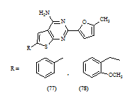 A novel series of benzyl substituted thieno [2,3-d]pyrimidines were identified as potent A2A receptor antagonists by Shook et al., 2013. Among the synthesized compounds, some of the compounds were screened for the ability to reverse cataleptic activity in mice. These compounds were typically tested as a single oral dose of 3 or 10 mg/kg in mice. The compounds 77 and 78 were found active at 10 mg/kg [46].