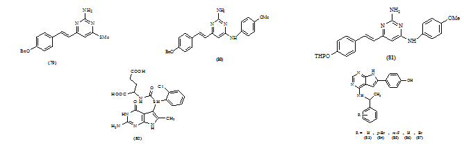 Suryawanshi et al., 2013 designed and synthesized a library of substituted aryl pyrimidine derivatives. All these compounds were screened in vitro by reporter gene luciferase assay for their antileishmanial property against intracellular amastigotes of Leishmania donovani. Among them, 8 compounds showed promising IC50 values (0.5 to 12.9 μM). Selectivity indices (S. I.) of all these compounds were found better than reference drugs, sodium stibogluconate (SSG) and miltefosine. These compounds were further screened for their in vivo antileishmanial activity against L. donovani/hamster model. Compounds 79, 80 and 81 have shown significant inhibition of parasitic multiplication (88.4%, 78.1% and 78.2% respectively) at a daily dose of 50 mg/kg i. p. for 5 d. Compound 79 may be a new lead that could be explored as a new antileishmanial agent [48]. A library of classical antifolates, 2-amino-4-oxo-5-substituted pyrrolo[2,3-d] pyrimidines have been designed, synthesized by Kumar et al., 2013. The synthesized compounds were evaluated for Cryptosporidium hominis thymidylate synthase (ChTS) inhibitory activity. Crystal structure of several hydrophobic, Van der Waals and hydrogen bonding interactions were studied between most potent compound 82 and FdUMP; compound 82 and active site residues, with a Ki of 8.83±0.67 nM. Therefore, compound 82 may be a lead compound for analog design and as ChTS specific inhibitors [49]. Kaspersen et al., 2012 designed, synthesized and evaluated 6-aryl-pyrrolo [2,3-d]pyrimidine-4-amines for their antiprotozoal activity using Tetrahymena as the model organism. The protozoacidal activity results showed that compound 83, 84, 85, 86 and 87 were found to be highly potent at a dose concentration of 8–16 μg/ml [47].