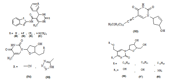 Chikhale et al., 2015 designed synthesized and characterized derivatives of benzothiazolyl pyrimidine-5-carboxamides. These derivatives were synthesized by three component one pot reaction involving benzothiazolyl oxo butanamide, thiourea and substituted aromatic benzaldehydes. All of these derivatives were evaluated for antitubercular activity. Compound 89, 90, 91 and 92 were found active against Mycobacterium tuberculosis (H37Rv) with MIC= 0.08, 0.09, 0.09 and 0.08 μM respectively and IC50 = 7.7±0.8, 9.2±1.5, 11.1±1.8 and 10.3±2.6 respectively. Log P study of these compounds was found to be between 2.0 and 3.0 making them suitable for oral dosing. Furthermore, DprE1 selectivity and pharmacokinetic studies indicated that compound 89 and 92 were found to be highly selective, and bioavailability was found to be above 52% by oral dose [52]. Matyugina et al., 2012 synthesized a series of new carbocyclic uracil derivatives and tested for their antituberculosis potential. The results revealed that compound 6 showed best antituberculosis activity against two strains of Mycobacterium tuberculosis: laboratory sensitive (H37Rv) and MDR strain (MS-115) resistant to five top antituberculosis drugs (isoniazid, rifampicin, streptomycin, ethambutol and pyrazinamide). The compound 93 showed the same level of antituberculosis activity both as a racemic mixture and individual (+) and (-) enantiomers [53]. Toti et al., 2013 synthesized some 50-modified thymidines and 5,5’-bis-substituted 20-deoxyuridine analogs and screened them for inhibition potency of thymidine monophosphate kinase of Mycobacterium tuberculosis (TMPKmt) by using spectrophotometric binding assay (Ki). Compound 94 (Ki = 48 μM) and 95 (Ki = 70 μM) were found to be highly potent among all [54]. Shmalenyuk et al., 2013 reported the synthesis of C5 modified pyrimidine nucleoside derivatives and screened them for their antituberculosis capacity. 5-dodecyloxymethyl-2’-deoxyuridine (96), 5-decyl triazolidomethyl-2’-deoxyuridine (97) and 5-dodecyltriazolidomethyl-2’-deoxycytidine (98) showed maximum in vitro inhibition of growth of Mycobacterium tuberculosis strains-laboratory H37Rv (MIC99 = 20, 10, and 20 μg/ml, respectively) and clinical MDR MS-115 resistant to five top antituberculosis drugs (MIC99 = 50, 10, and 10 μg/ml, respectively) [55].