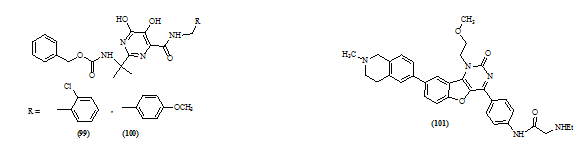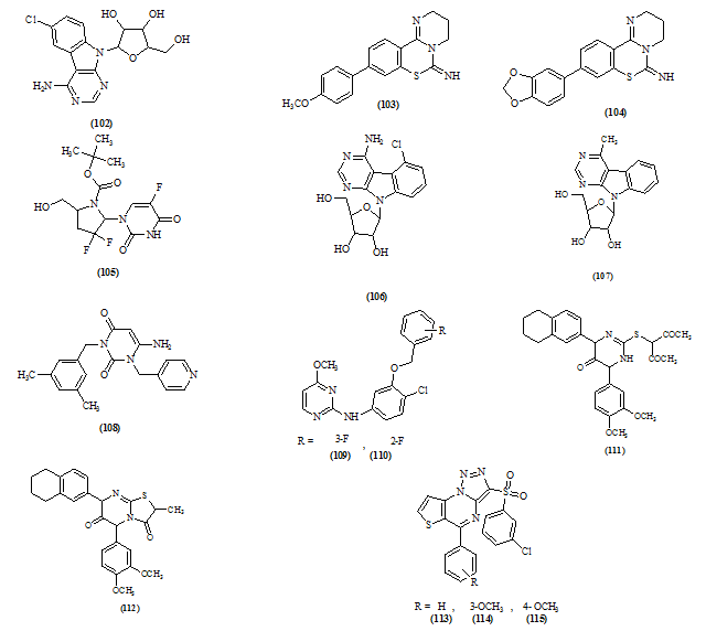 A small library of 5, 6-dihydroxypyrimidines were synthesized and tested in vitro for their anti-HIV activity profile by Guo et al., 2012. Among the synthesized compound, 99 and 100 showed significant anti-HIV activity with EC50 values of 0.14 and 0.15 μM respectively, and TI (therapeutic index) values of>300 and>900, respectively. Thus, the study results showed that 5,6-dihydroxypyrimidines may act as a lead compound for the discovery of potent anti-HIV agents as they showed decreased cytotoxicity with high therapeutic index [56]. Tremblay et al., 2013 demonstrated the synthesis of benzofurano[3,2-d]pyrimidine-2-one and tested the synthesized compounds for nucleotide-competing HIV-1 reverse transcriptase inhibitors (NcRTI) activity. Compound 101 exhibited promising overall in vitro properties as HIV-1 RT inhibitors. Therefore, it revealed the potential of benzofurano[3,2-d]pyrimidine-2-one derivatives as a class of future anti-HIV agent [57]. Tichy et al., 2012 designed, synthesized and characterized a new set of pyrimido[4,5-b]indole ribonucleosides derivatives and tested for biological activity for Dengue virus. Among all the compounds, 102 exhibited significant activity against Dengue virus with IC50 value 0.85 μm against Vero cells DENV-2 [58]. Mizuhara et al., 2012 identified the synthesis of pyrimido[1,2-c][1,3]benzothiazin-6-imine derivatives as a potent antiretroviral agent. Among them, compound 103 and 104 showed threefold higher anti-HIV activity than that of PD 404182 [59]. 20,30-dideoxy-20,20-difluoro-40-azanucleoside derivatives of both pyrimidine and purine nucleobases were synthesized by Martínez-Montero et al., 2012 and evaluated them for their anti-HIV-1 and anti-HCV activity. Among the series, 40-azanucleosides (105) was found to be the most active compound (EC50 = 36.9 μM) and none of the compounds were found to possess anti-HCV activity [60]. Two series of new 4-aminopyrimido[4,5-b]indole ribonucleoside derivatives were synthesized by Tichy et al., 2013. All of these compounds were tested for antiviral activities against HCV and dengue viruses. Compound 106 exhibited significant anti-dengue and anti-HCV activity but with some level of cytotoxicity. Compound 107 showed high anti-HCV activity with low cytotoxicity [61]. Sakakibara et al., 2013 synthesized a library 3-(3,5-dimethylbenzyl)uracil analogs and evaluated them for non-nucleoside HIV-1 reverse transcriptase inhibition potential. Among these compounds, 108 was found to be potent against HIV-1 activity (EC50 =0.03 μM and a high selectivity index=2863). Thus, compound 108 may serve as a lead for further optimization of anti-HIV drugs [62]. Rai et al., 2013 designed, synthesized and evaluated 3-benzyloxy-linked pyrimidinyl phenyl amine derivatives for their in vitro anti-HIV activity in MT-4 cell cultures. Almost all the compounds showed inhibition of wild-type (wt) HIV-1 replication (EC50 = 0.05–35 μM) with high selectivity index (SI) values (10 to>4870). Compounds 109 and 110 exhibited excellent antiretroviral activity against wt HIV-1 with low cytotoxicity (EC50 = 0.07 μM, CC50>347 μM, SI>4870; EC50 = 0.05 μM, CC50 = 42 μM, SI = 777, respectively), compared to marked drug nevirapine (EC50 = 0.113 μM, CC50>15 μM, SI>133) [63]. Mohamed et al., 2010 designed, synthesized and evaluated some substituted pyrimidine derivatives for their anti-HSV-1 potential. The antiviral screening exhibited that compounds 111 and 112 have over 90% inhibition comparable to standard Acyclovir. These compounds may be considered highly promising antiviral agent for further investigations [64]. Kim et al., 2013 identified a series of triazolothieno pyrimidine (TTPM) compounds as potent HIV-1 replication inhibitors. By performing a cell-based full replication assay, it was found that aryl substituted TTPM derivatives 113, 114, and 115 showed significant inhibitory activity along with acceptable safety margins [65].