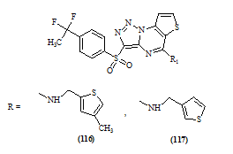 Liu et al., 2013 designed and synthesized some analogs of the UT-B inhibitor on the basis of already synthesized triazolothienopyrimidine derivatives which were reported as UT-B inhibitors. All the synthesized compounds were characterized by the structural requirements for potency and microsomal stability to behave a compound as UT-B inhibitor scaffold. Two compounds 116 and 117 with nanomolar inhibitory potency (IC50 = 40 nM) were found to be active [66].