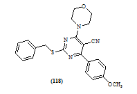 Stella et al., 2013 synthesized a novel class of pyrimidine derivatives and screened them for immunosuppressive activity by using the Mixed Lymphocyte Reaction assay. This is also called as the in vitro model for in vivo rejection after organ transplantation. By replacement of the substituents at positions 2, 4 and 6 of the pyrimidine scaffold resulted in the discovery of 2-benzylthio-5-cyano-6-(4-methoxyphenyl)-4-morpholinopyrimidine 118 which can be used for further optimization of more efficient immunosuppressive drugs. The IC50 value of this compound was found to be 1.6 μM by performing the MLR assay [67].