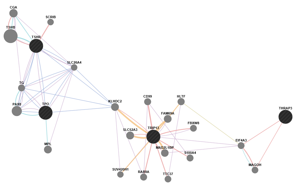 Four differently transcribed mRNA’s regulated by lncRNA, including TSHR, TPO, THRAP3, TIRAP3 were subjected to GENEMANIA analysis (fig. 3). Three TSHR, TPO and TRIP13 were found to be in a functional network in terms of co-expression. Also, TSHR, TRIP13 and THRAP3 are involved in physical interactions.
