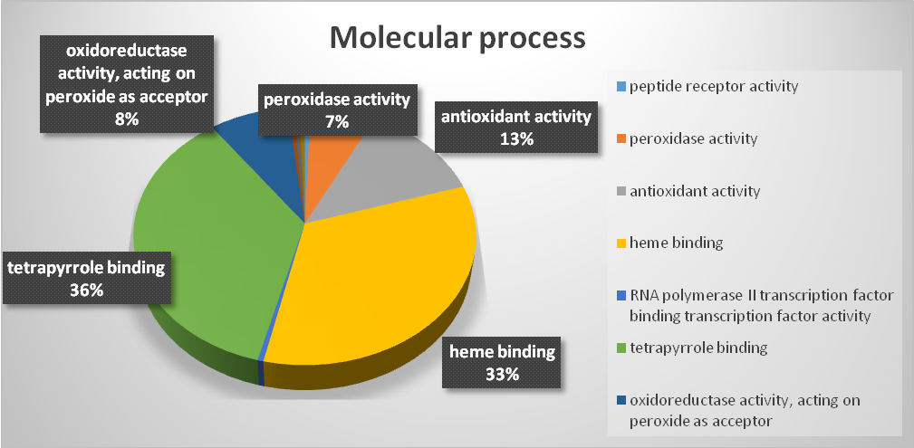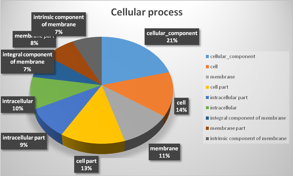 Molecular ontology illustrates seven top ten ontologies which have tetrapyrrole binding with 36%, heme binding 33%, antioxidant activity 13%, oxidoreductase active acting on peroxide as receptor 8%, and peroxidase activity 7%. There are nine ontology terms associated with the cellular process, and 21% of genes are involved in cellular processes (fig. 6), 14% in the cell, and 13% in cell part, intracellular part, an integral component of the membrane and intrinsic component of cell membrane. From the cellular process, it was found that most of the gene product functions are related to cell. GO analyses predicted that lncRNAs targeted mRNA were associated with the metabolic process (ontology: biological process), cell (ontology: cellular component) and binding (ontology: molecular function).