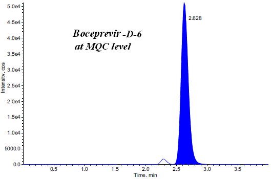 Six different lots of plasma were analyzed to ensure that no endogenous interferences were present at the retention time of Boceprevir and Boceprevir D6. Six LLOQ level samples along with plasma blank from the respective plasma lots were prepared and analyzed. (Table-1) shows results of specificity. In all plasma blanks, the response at the retention time of Boceprevir was less than 20% of LLOQ response and at the retention time of IS, the response was less than 5% of mean IS response in LLOQ.