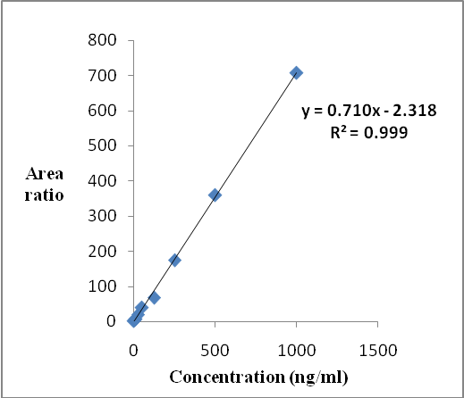 Results: The concentrations of nine working standards showed linearity between 2 to 1000 ng/ml (r2 ≥ 0.998). Chromatographic separation was achieved within 3 min. The limit of Quantification (LOQ) was found to be 2ng/ml. The intraday and interday precision with quality control samples was found to be 0.09 to 3.17%.