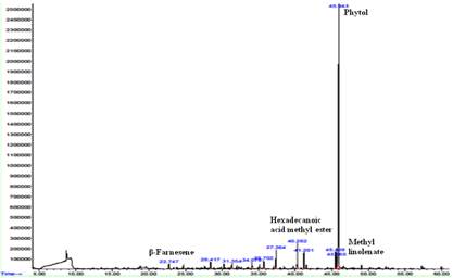 The leaf and rhizome extracts of Kaempferia parishii were analyzed by GC-MS for determining their chemical constituents, and it revealed the presence of 7 and 8 identified components accounting for 92.1% and 82.86% of the leaf and rhizome extract respectively (Fig: 1 and 2). In leaf extract phytol (72.55±0.5%), hexadecanoic acid methyl ester (4.94±0.2%), hexahydro farnesyl acetone (3.78±0.2%), dibutyl phthalate (3.31±0.2%) were found to be the major constituents and in case of rhizome extract totarol (74.96±0.86%), cembrene (2.83±0.2%), borneol (1.23±0.15) were the major constituents(table 2 and 3).