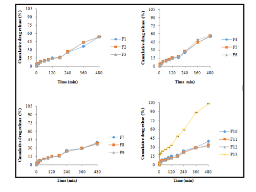 Fig. 2: In vitro release profile of diclofenac sodium with various concentrations of co-processed excipients matrix of crosslinked amylose-xanthan gum (formula F1-F13). All values are expressed as mean±SD, n = 3