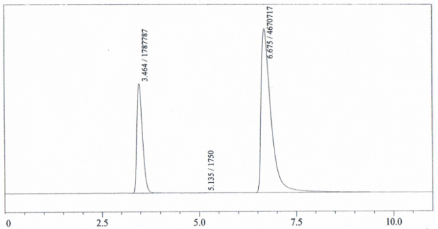 The data was recorded using Lab Solutions Software. Separation was carried out at 33 °C, using LiChrosorb®RP-18 (250 x 4.6 mm) column packed with octadecylsilyl silica gel 5 μm. The detector was set at 290 nm. The mobile phase was prepared by mixing of triethylamine: o-phosphoric acid and аcetonitrile (0.02:80:20 v/v/v). The mobile phase was sonicated for 10 min and then it was filtered through a 0.45 μm filter paper. The chromatographic conditions were found to yield good separation with a retention time of 3.46 min for MET and 6.68 min for CIP with sharp symmetrical peak. The chromatogram is shown in fig. 1.