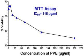 Fig. 1: Determination of PPE cytotoxicity for human liver carcinoma HepG2 cell line by using MTT assay. The values are expressed as mean±SD (n=3), SD value are too small to be seen on the blot. Values were plotted by using GraphPad PRISM program (GraphPAD, UK). IC50 (inhibitory concentration 50) = 115 µg/ml