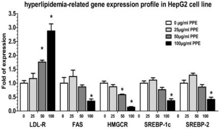 Methods: Using reverse-transcription real-time PCR, an in vitro study harnessing HepG2 cell line was conducted to determine the hyperlipidemia-related gene expression profiles and cytotoxic effects upon treatment with PPE. In another complementary in vivo study, male C57BL/6J mice were fed a high-fat diet (HFD) or an HFD supplemented with PPE for 14 d to define the expression of lipid metabolism related genes that control obesity. Fatty liver proportions were also estimated after treatment.
