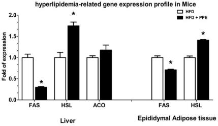 In addition, we conducted an animal study to investigate the effect of on visceral fat levels and hepatic lipid accumulation in mice with diet-induced obesity. We focused on determination of expression profiles of genes related to beta-oxidation and lipogenesis in the liver and lipolysis in white adipose tissue after 14 d of PPE oral administration.