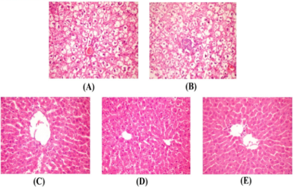 Fig. 4: Histological analysis of the liver (Hematoxylin and eosin (H&E) stain). The liver was extracted 14 d after commencing the treatment. H&E staining was performed in frozen liver sections to detect the presence of fat. These images are representative of observations made on 8 mice per group. (Scale bar: 50 μm). The liver of mice feeding on HFD; fig. (4; A and B) show microvesicular fatty change distributed throughout the liver lobules accompanying with focal necrosis while the liver of mice feeding on HFD and PPE; fig. (4; C, D and E) show normal histological change with reduction in fat deposits in liver tissues
