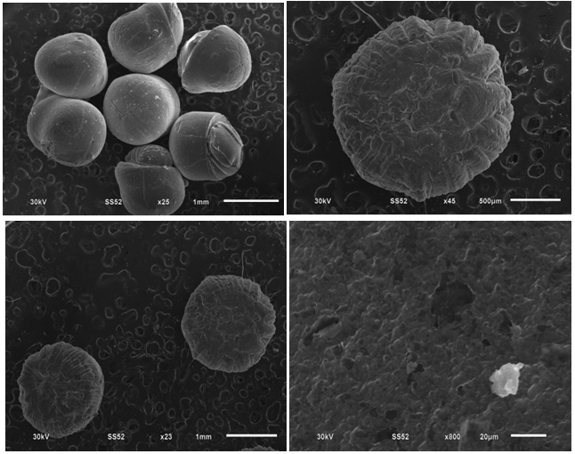 In this research, PHCL microspheres were prepared using three different divalent cations, calcium, barium and zinc as cross-linking agents, with chitosan added to them. Chemical cross-linking of hydrophilic polymers is a typical approach to form microspheres, and the physicochemical properties of the prepared microspheres are highly dependent on the cross-linking type, as well as the molecular weight and chemical composition of the used polymers. fig. 1, illustrated an example of the prepared microspheres before and after the drying process.