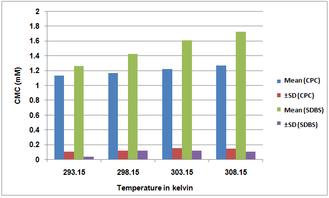 Effect of temperature on CMC of SDBS and CPC is shown in fig.2. CMCs of SDBS and CPC increased linearly with increase in temperature which signified the increase in thermal motions of surfactants and the solvent system. These increased thermal motions were responsible for the disruption of water structure and inhibited the formation of ordered structure of micelles. So CMC was directly proportional to the degree of disruption of ordered micellar structures [12].