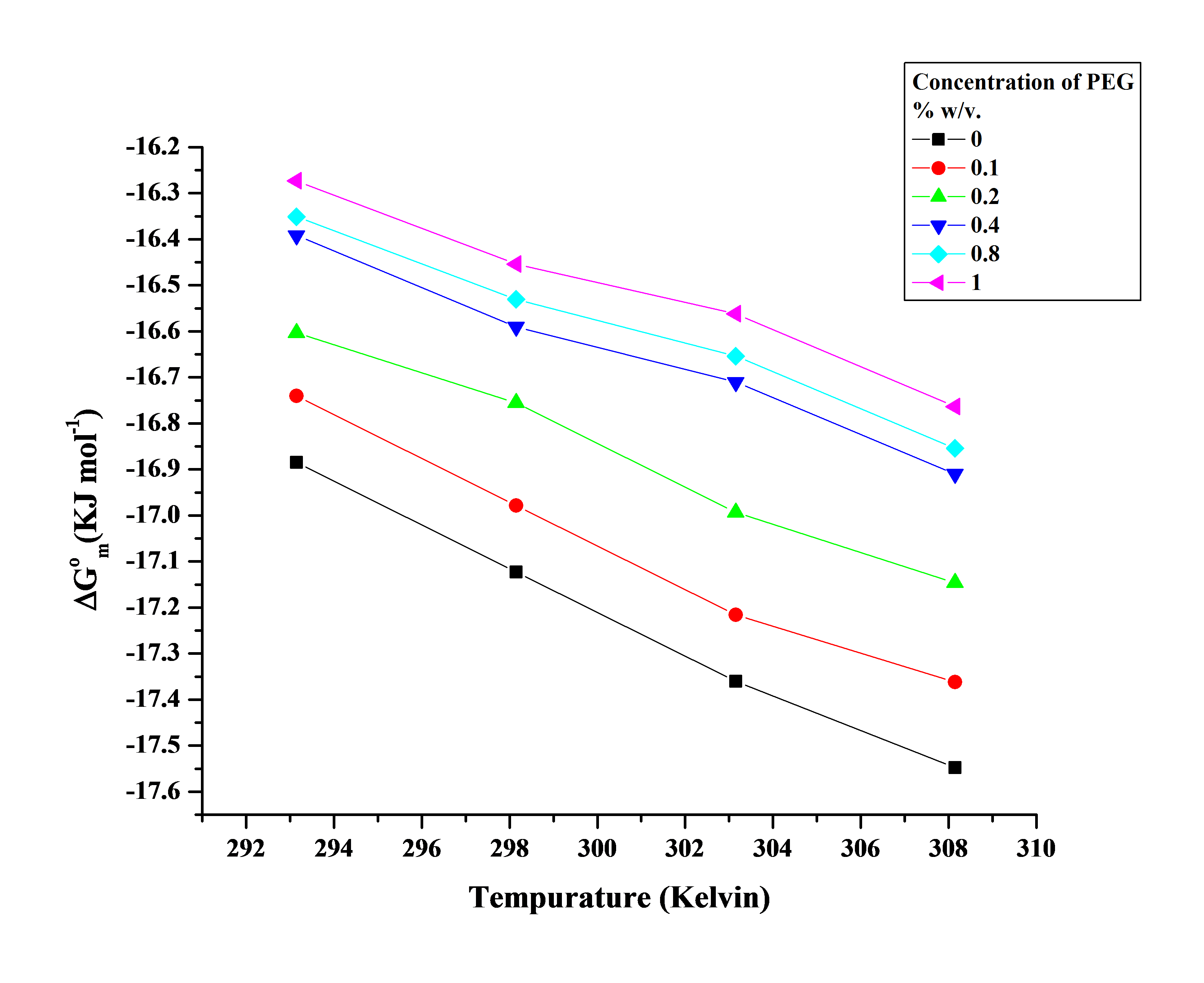 Fig. 4: Effect of temperature and PEG concentration on change in free energy of micellization ΔG °m (kJ mol-1) of SDBS in terms of mean values