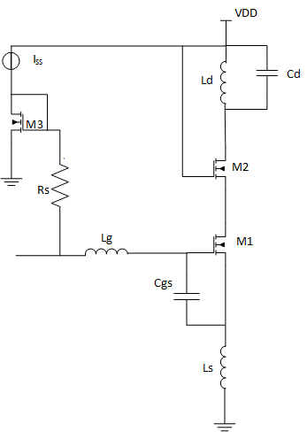 In fig. 2, there is a cascode common-source with inductive degeneration [4]. The M1 and M2 consisted of cascode opamp and the tank circuit consisted of by Cd and Ld. The transistor M3 was used for amplifier biasing. The purpose of inductors Lg, Ls and capacitor Cgs was to match to the 50Ωinput. The degeneration inductor Ls had better linearity at the cost of lower gain for linearity. Rs was used to isolate the RF biasing signals. Other capacitors were used to block DC signals.