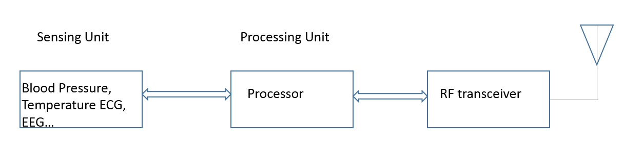 Fig. 1 shows that the basic sensing unit can collect physiological signals (e. g.: such as EEG, ECG, body temperature, pressure etc.), blood when individual sensors are attached to the human body [2]. The processing unit processes all the sensed signals, then processes all the data based on the communication protocols. All the processed data will be transmitted through a wireless link to a portable personal base-station.