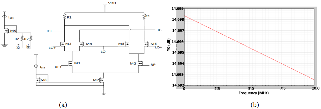 Gilbert mixer, as seen in fig. 5 (a), provides good port-to-port isolation with some conversion gain [4]. The M1 and M2 are the input stages operating in the saturation region.