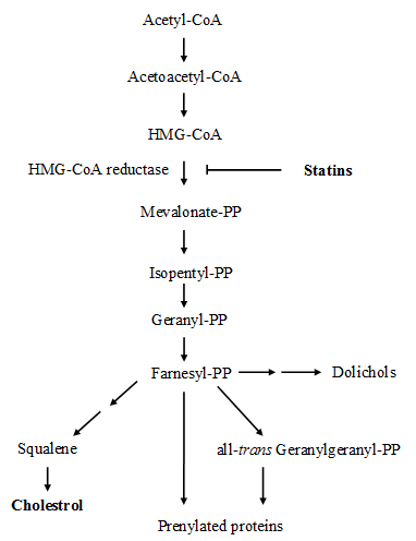 Most mammalian cells can produce cholesterol through cholesterol biosynthesis pathway. This complex process involved more than 30 enzymes and the details pathway was extensively studied in the 1950-1960s [20]. The simplified version of the biosynthesis was reduced in fig. 1. An early attempt to reduce cholesterol biosynthesis was not successfully encouraged when triparanol introduced in mid-1960 for the clinical trial was withdrawn from the market after it developed cataract and tissue accumulation of desmosterol, the substrate for the inhibited enzyme [21].