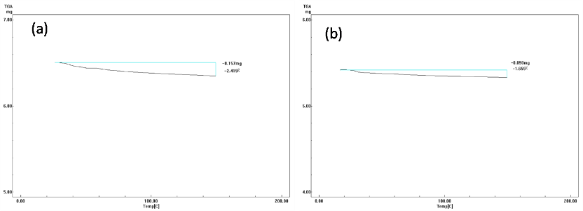The water content of SDP formulations was examined by Thermogravimetric analyzer (Perkin Elmer, Pyris I-Wellesley, USA). Samples of 3-5 mg of SDP were heated to 150 ᵒC under nitrogen purging, at a constant heating rate of 10ᵒC/min. The percent weight loss was calculated as its water content was evaporated and defined as the moisture content. It was expressed as percent of the initial powder weight.