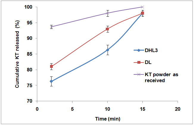 Fig.4 shows that KT powder as received dissolved at a fast rate releasing 95% of the drug in 5 min. The same release pattern occurred with formulae DHL3and DL where 100% release was achieved in less than 15 min. the presence of HA with its carboxyl and hydroxyl groups did not retard the drug release [42, 43]. Achieving complete drug dissolution in a short time will help to avoid uptake of MPs by the macrophages freely roaming in the alveolar region.