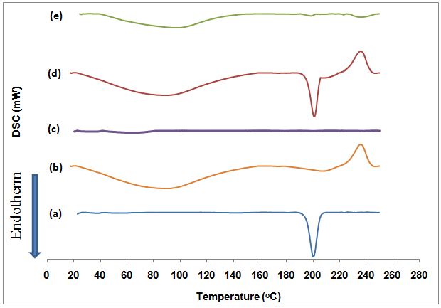 Fig. 6: DSC of(a) ketotifen hydrogen fumarate, (b) hyaluronic acid, (c) leucine, (d) physical mixture of 1:1:1 (KT: HA: leucine) and (e) selected spray dried formula DHL3