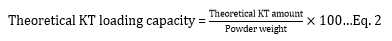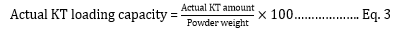Drug content was determined and the drug association efficiency percentage (AE%) in the spray dried powder (SDP) was calculated by comparing the actual with theoretical drug loading values as follow: an accurately weighed amount (10 mg) of each SDP was added to 2 ml water and then stirred for 15 min at room temperature. After proper dilution, the drug content was determined by UV spectrophotometry at the predetermined λmax (300 nm). KT AE%, theoretical and actual loading were calculated using equations 1-3.