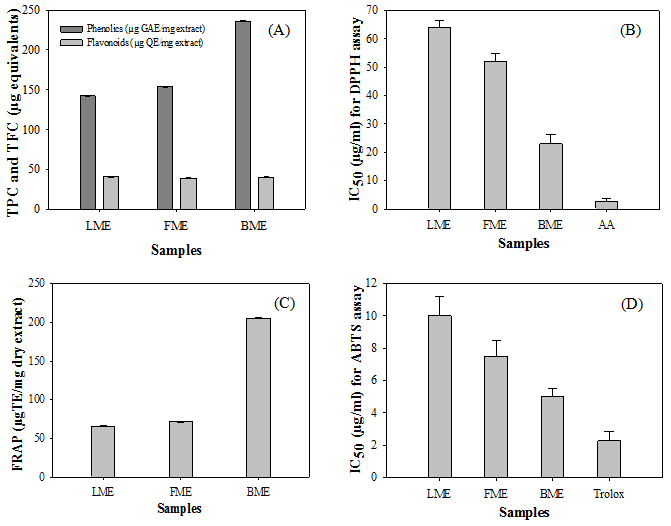 Fig. 1: Phytochemical screening of D. sissoo extracts with respect to TPC, TFC and FRS activities; (A) TPC and TFC; (B) DPPH free radical scavenging capacity; (C) Ferric reducing antioxidant power (FRAP); (D) ABTS free radical cation scavenging activity. (mean±SD, n=3). (LME= Leaves methanolic extract; FME= Fruits methanolic extract and BME= Bark methanolic extract)