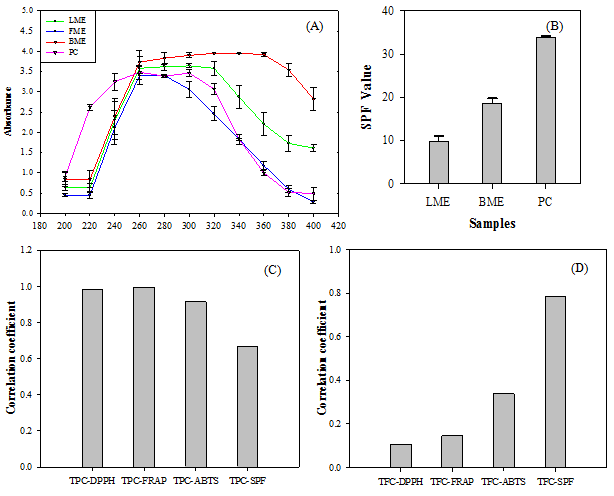 Fig. 2: (A) Absorption spectrum in UV range (200-400 nm); (B) SPF values (LME= Leaves methanolic extract; BME= Bark methanolic extract and PC= Positive control); (C) and (D) Correlation of TPC and TFC with FRS and SPF, respectively (Mean values of each assay were used to perform the correlation studies)