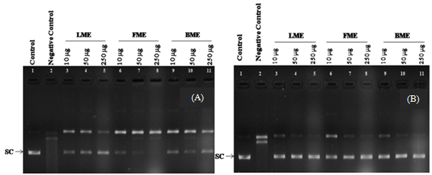 Due to the formation of highly reactive and strong oxidizing hydroxyl radical, the native supercoiled (SC) configuration of plasmid DNA changes to open circular and nicked linear forms, which cause a change in their electrophoretic mobility properties on the gel. To assess the potential of test extracts in preventing the DNA damage from oxidative stress, we used DNA nicking assay for non-site specific hydroxyl radical scavenging activity [48]. Protection of DNA can be described in terms of protection of SC form after extracts’ treatment as seen in fig. 3A. At the lower concentrations (10, 50 μg) LME and BME have shown partial DNA protection exhibited by a faint band of SC form while at high concentration (250 μg) protection was more. Protection of the plasmid DNA from damage was in a dose-dependent manner except in the case of FME, where the reverse pattern was obtained.
