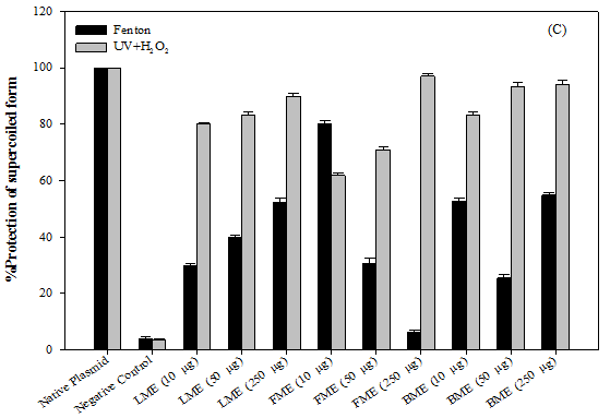 Hydroxyl radical induced DNA damage and its prevention by extracts were estimated by Fenton reaction and UV+H2O2 induced generation of hydroxyl radicals. Densitometric analysis of DNA bands using Image J software was done to measure the degree of plasmid DNA protection in terms of percentage.