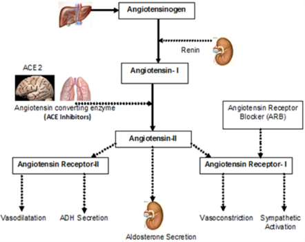 The renin–angiotensin system (RAS) or the renin–angiotensin–aldosterone system (RAAS) is a hormone system that regulates blood pressure and water (fluid) balance. When renal blood flow is reduced, juxtaglomerular cells in the kidneys convert the prorenin already present in the blood into renin and secrete it directly into circulation. Plasma renin then carries out the conversion of angiotensinogen released by the liver to angiotensin I [1]. Angiotensin I is subsequently converted to angiotensin II by the enzyme angiotensin-converting enzyme. Angiotensin II is a potent vasoactive peptide that causes blood vessels to constrict, resulting in increased blood pressure. Angiotensin II also stimulates the secretion of the hormone aldosterone from the adrenal cortex [2]. Aldosterone causes the tubules of the kidneys to increase the reabsorption of sodium and water into the blood. This increases the volume of fluid in the body, which leads to elevated blood pressure [3]. Fig. 1 below illustrates the pathways of the RAS system.