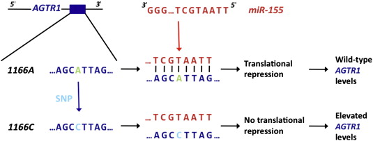 A polymorphism in the 3’-untranslated region of the AGTR1 gene (A1166C) has been linked in several studies with essential hypertension. In wild-type A1166, a translational repression occurs, and the AT1 receptor is translated in normal levels. On the other side, with the variant-type C1166 translational repression does not happen and as a result, the AT1 receptor is translated with elevated levels which lead to the increase of the receptor function [7].