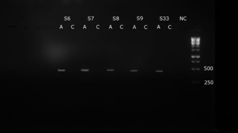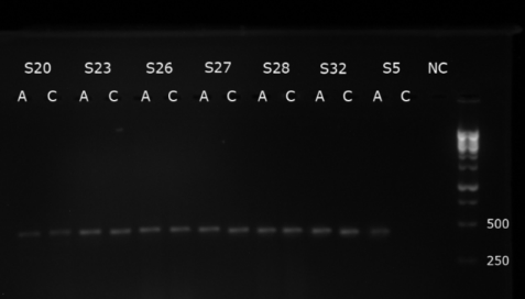 Fig. 4: The electrophoresis profiles for some of the successful amplifications. Samples 5, 6, 7, 8, 9 and 33 have the homozygous genotype AA, while samples 20, 23, 26, 27, 28 and 32 has the heterozygous genotype AC. The ladder we used is GeneRuler 1 kb DNA Ladder, Fermentas