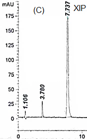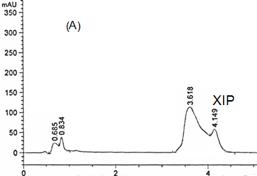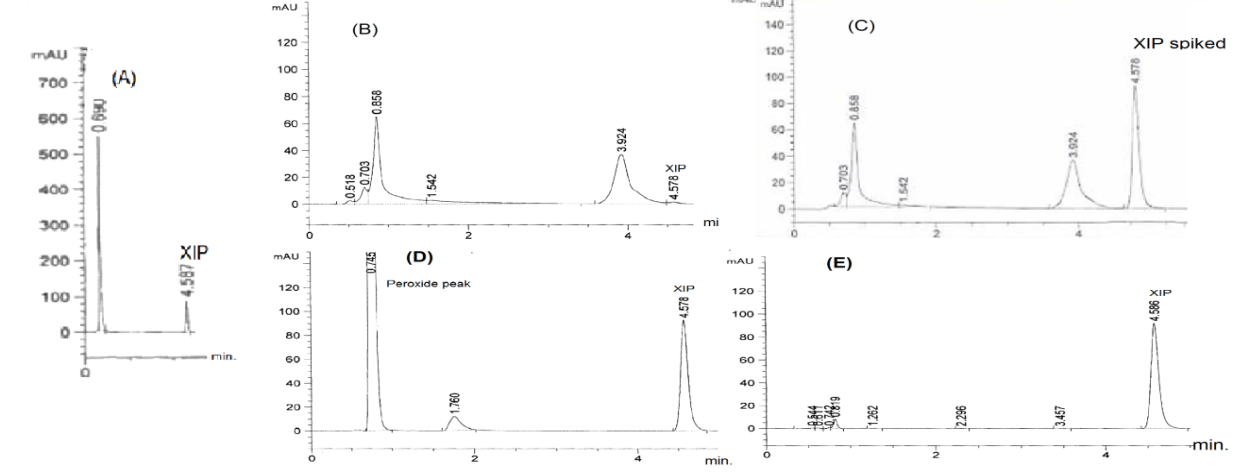 For the determination of XIP and its degradation products, an isocratic mobile phase consisting of 0.023 M orthophosphoric acid of pH 2.6 and acetonitrile as the mobile phase in the ratio of 60: 40 was used, 1.5 ml/min flow rate at room temperature. pH is adjusted using H3PO4 and NaOH. 10 µl of sample was injected each run. Detection was achieved at 220 nm.