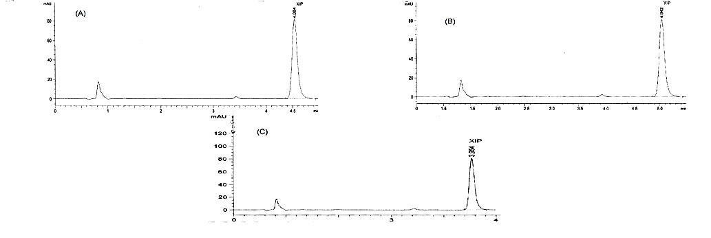 Fig. 3: A typical chromatogram of a 10 μl injection of a standard mixture of XIP (100 μg/ml) using (A) 35% acetonitrile (B) Alkaline degradation at pH 5.0 (C) Sunlight degradation using 35% ACN, flow rate = 1.0 ml/min and the other chromatographic conditions as optimized
