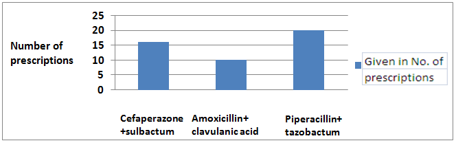 Fixed dose combinations have been seen in some prescriptions, of which piperacillin+tazobactum (n=20) is the most common one. It was indicated in the [fig 1].