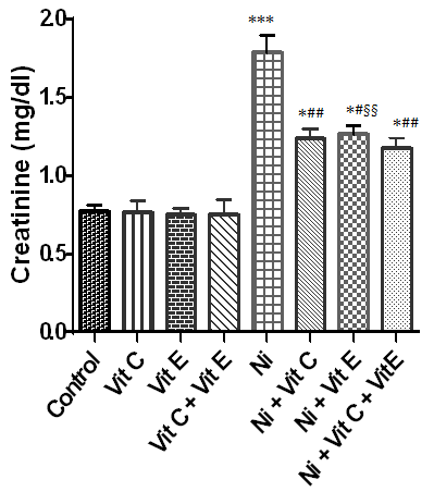 Values are given as mean±SEM of eight mice each group.StatisticalySignificantly differences from control: *p<0.05, **p<0.01, ***p<0.001; from Ni: # p<0.05,, ##p<0.01, ###p<0.001; from Ni+Vit C+Vit E: §p<0.05, §§ p<0.01.