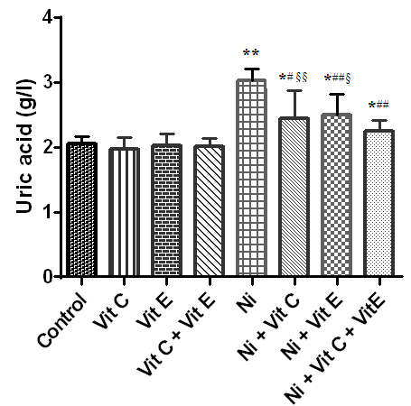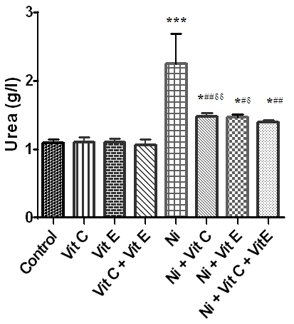But when compared with nickel group, a significant decrease of the above mentionned parameters was noticed [serum urea: Ni+Vit C, Ni+Vit C+Vit E (p<0.01) and Ni+Vit E (p<0.05); serum uric acid: Ni+Vit C (p<0.05), Ni+Vit E and Ni+Vit C+Vit E (p<0.01); serum creatinine: Ni+Vit C, Ni+Vit C+Vit E (p<0.01) and Ni+Vit E (p<0.05)]. In addition, vitamin C and vitamin E concomitent treatment with nickel effectively reduced more the above biochemical parameters when compared to nickel along with either vitamin C or vitamin E (fig. 1).